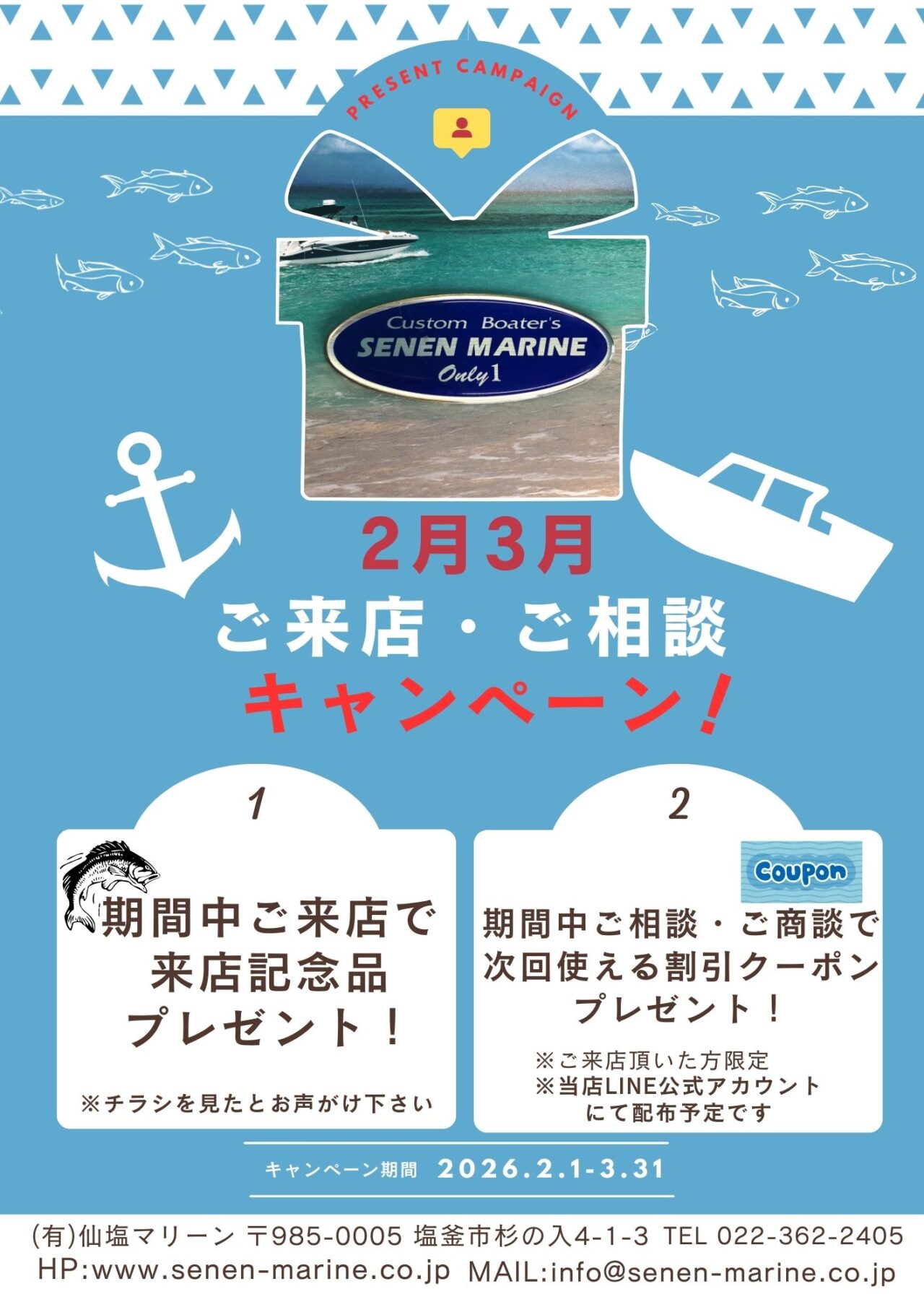 2月・3月ご来店、ご相談キャンペーン開催! 投稿者: senen-marine2026-02-09スタッフレポート、店舗新着情報 2月・3月限定! ご来店・ご相談キャンペーン開催! 期間中、ご来店いただいた方に 「このチラシを見た!」で ご来店記念品をプレゼント! 更にご相談、ご商談頂いた方に 次回ご利用いただけるクーポンをプレゼント! ※ご来店いただいた方限定 ※クーポンは当店LINE公式アカウントより配信予定です この機会にお友達登録をお願いします! こちらから→http://lin.ee/77UKZHJ 皆様のご来店お待ちしております!! 関連記事 本日進水しました! 3打、12打ロープ網 YAMAHA船外機SBWモデル YAMAHA VMAX