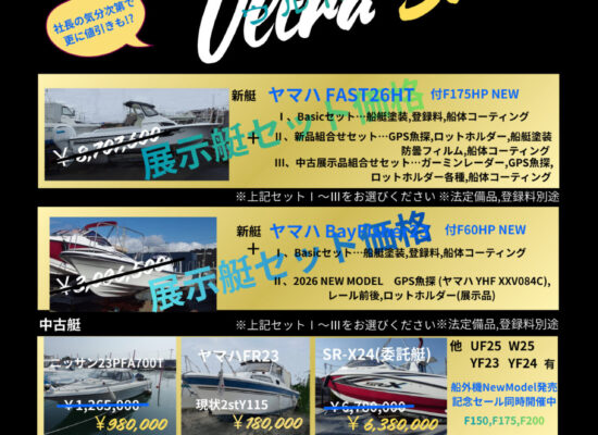 2026年1月5日よりスタート! 今回限りかも!?激熱ウルトラセール開催決定!! 新艇セット価格とセール内容詳細は LINE公式アカウントお友達登録後にお知らせいたします! この機会にぜひお友達登録をお願いします! LINEアプリから「仙塩…続きを読む →